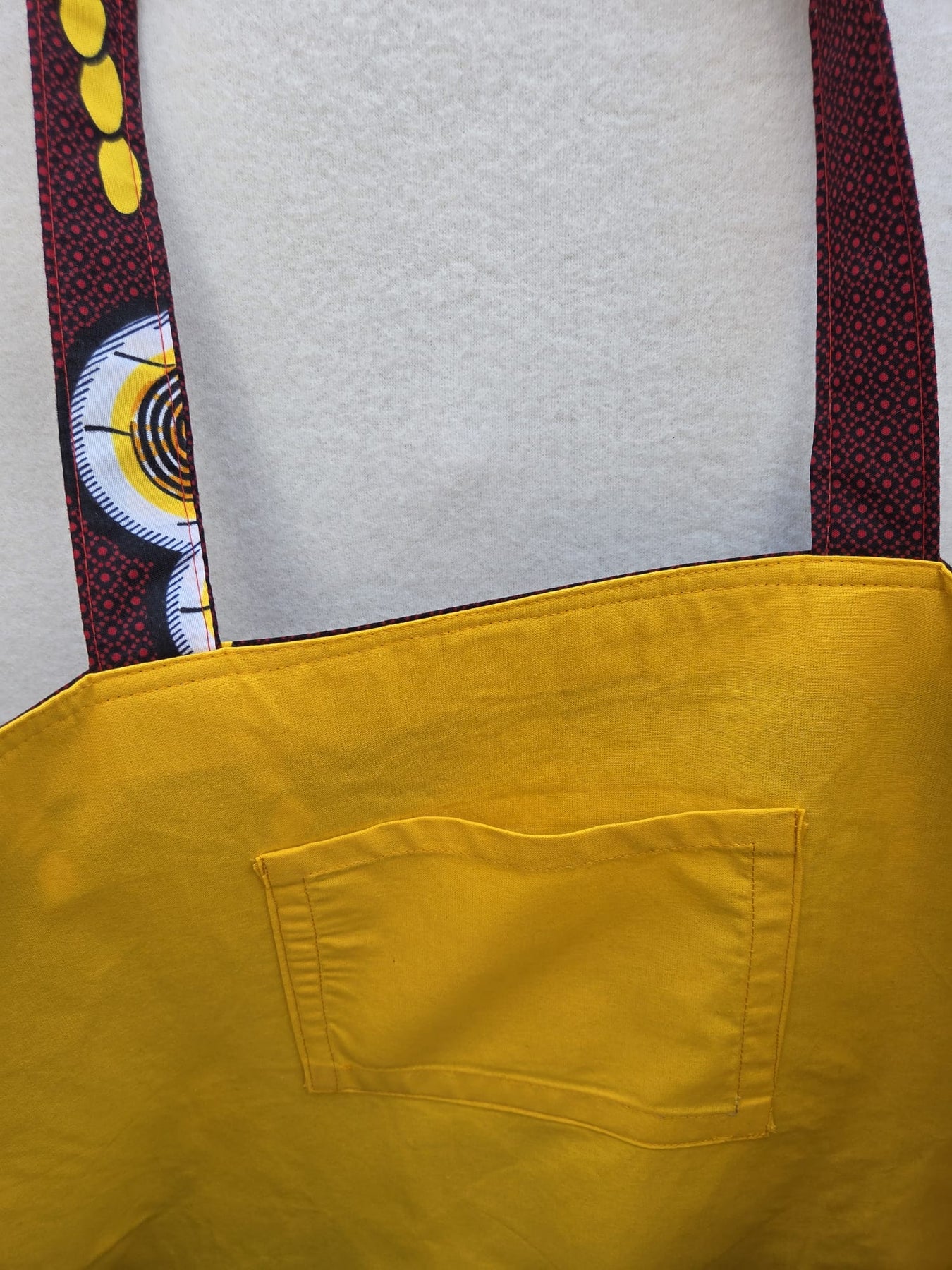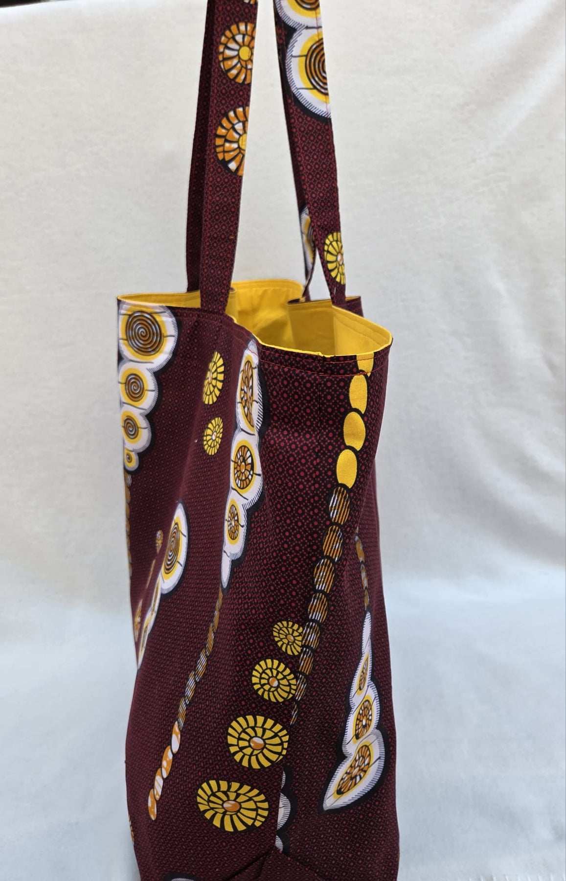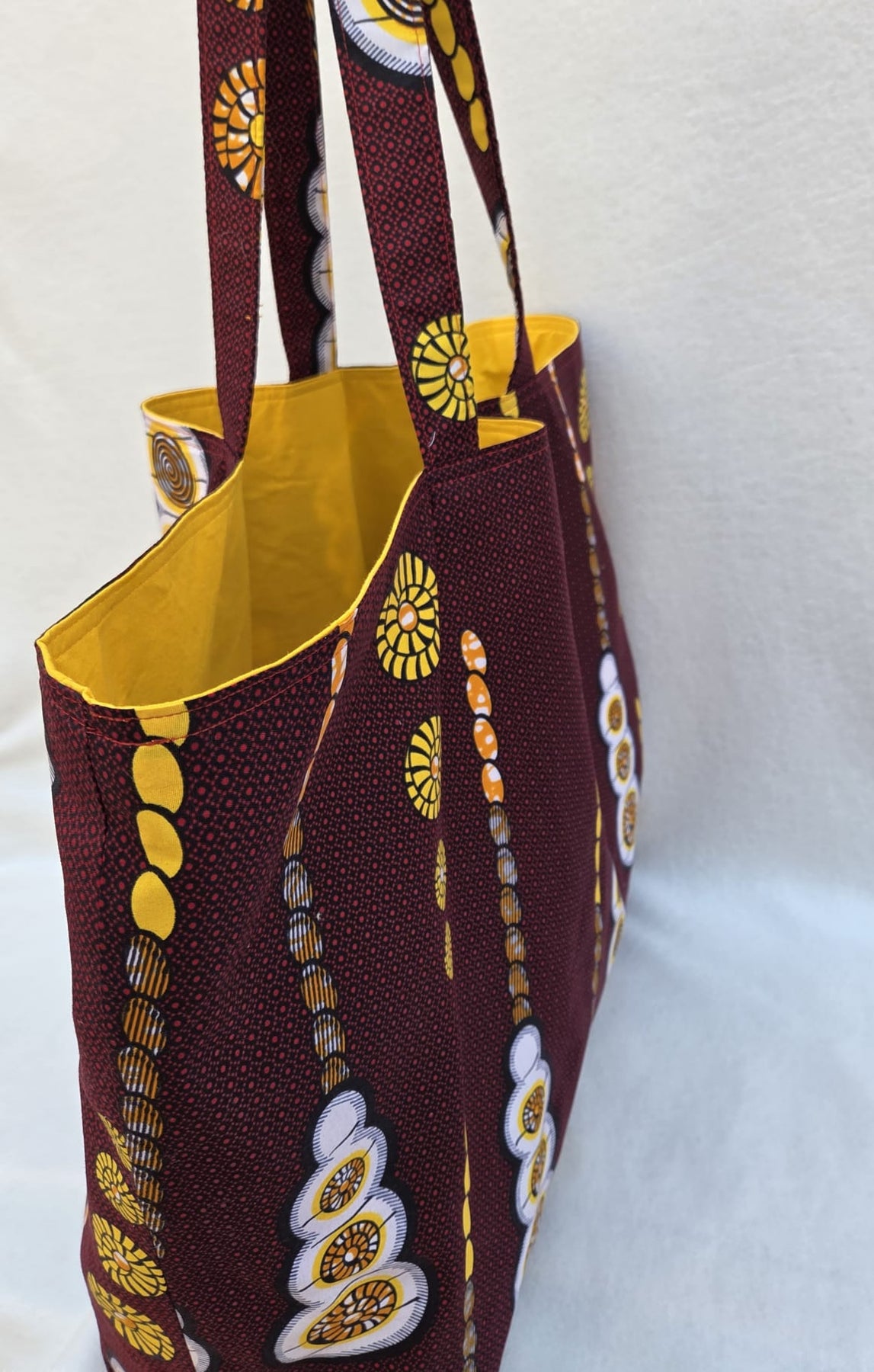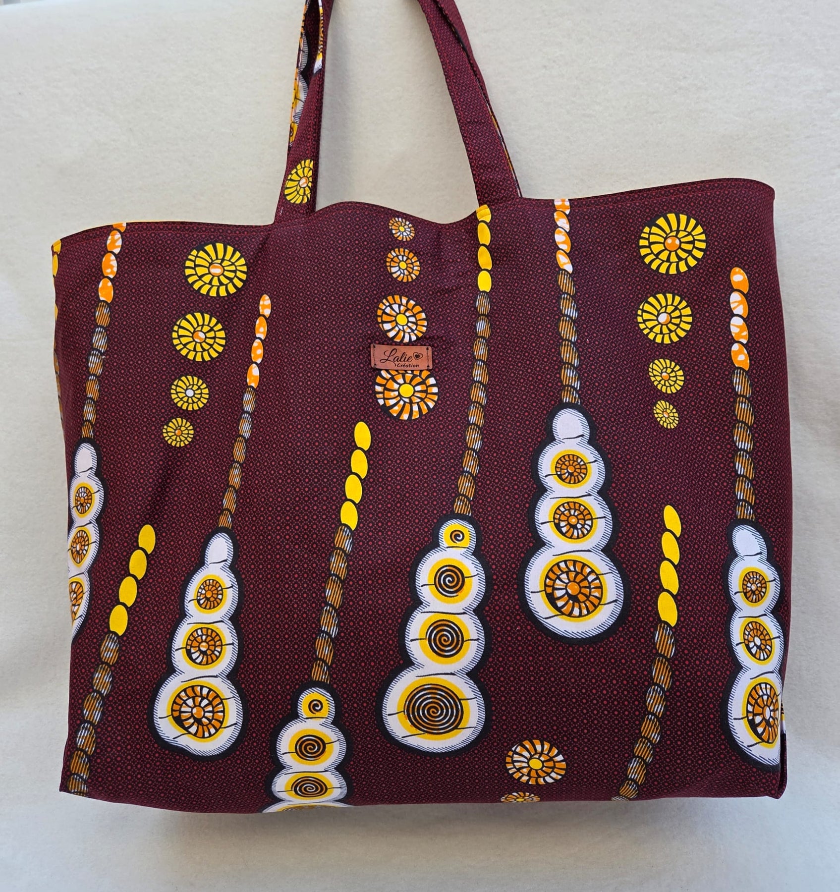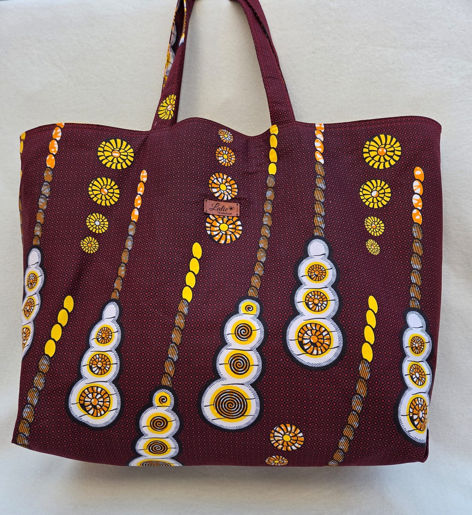 Avec ses motifs solaires et hypnotiques, ce cabas au fond bordeaux profond est une déclaration de style. Le jaune éclatant et les cercles graphiques insufflent une énergie joyeuse, parfaite pour les femmes en mouvement, libres et passionnées.